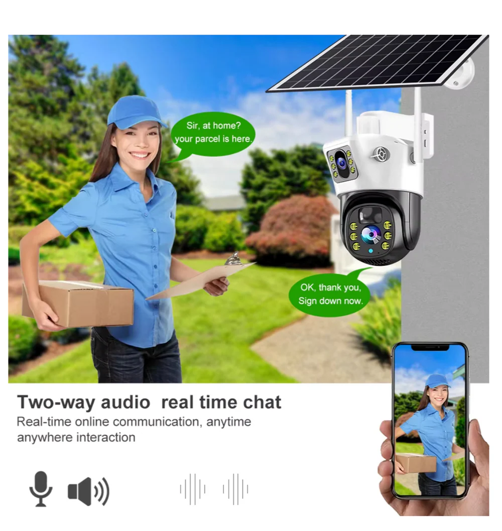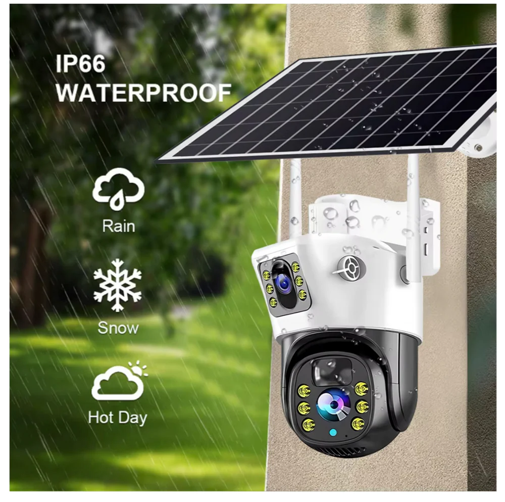 The DuoView Pro is a high-performance dual-lens solar security camera designed for indoor and outdoor protection. Equipped with two 1/2.9″ CMOS sensors (GC3003*2), dual 4mm lenses, and 6pcs dual-core infrared LEDs, it captures every detail—day or night. The system uses a combination of PIR and radar for accurate human detection, while a 3W speaker and long-range microphone support real-time voice intercom and alerts.