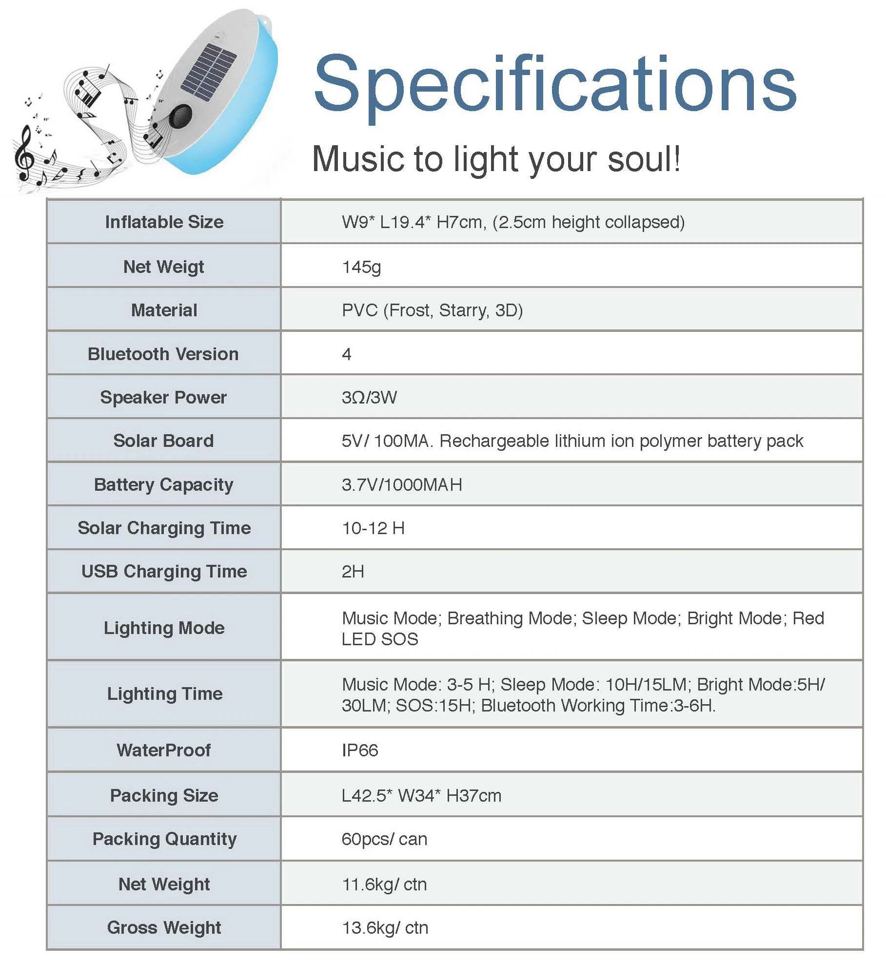 * Lighting Mode: Music Mode(Light colors changing as per Music playing); Breathing Mode(Light colors changing slowing); Flash Mode; Bright Mode; RED LED SOS