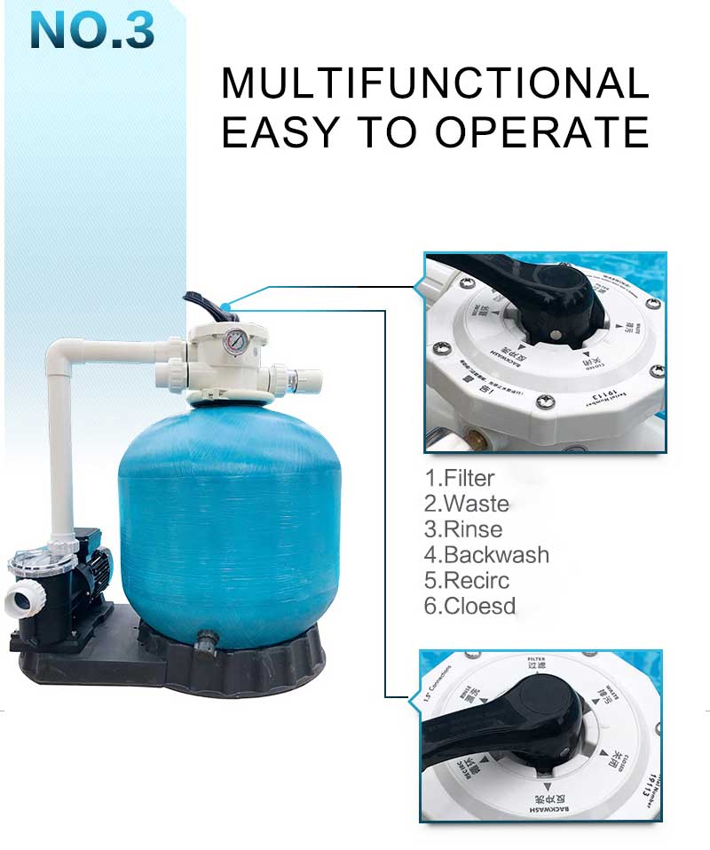 Until now, most swimming pools have used a traditional sand filter, which is filled with quartz as a filter medium to prevent water suspensions and impurities from entering the pool. Considering that the traditional sand filter itself is cleaned by reverse flow, and the dirt is washed out from the valve by backwashing, but it cannot completely discharge the dirt at the bottom. In fact, it does harm the water quality and affect human health. So it can purify the pool water more thoroughly.